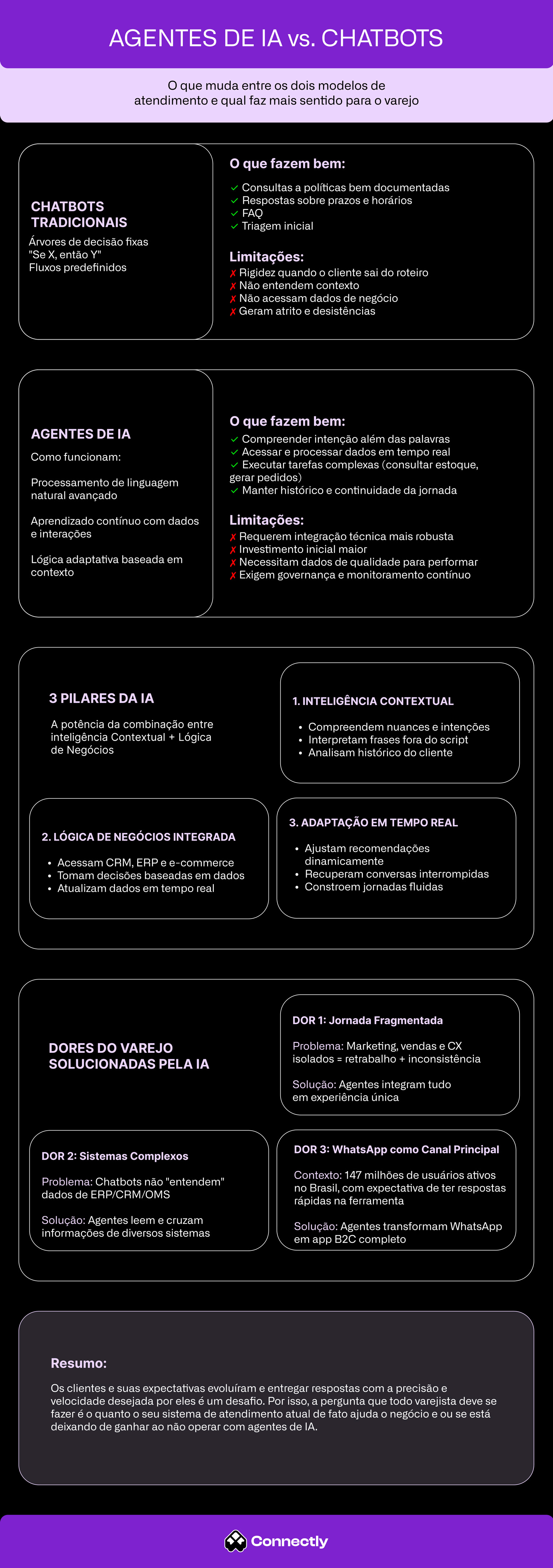 No infográfico completo ao final deste post, você verá lado a lado as capacidades, limitações e casos de uso de IA e de chatbots tradicionais no varejo — especialmente no WhatsApp, principal canal de relacionamento do consumidor brasileiro.